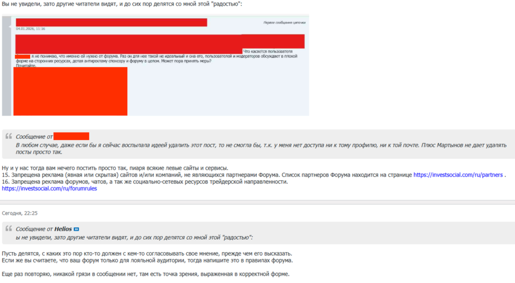 За годы общения на форуме investsocial я не раз видела, как в бан улетали люди, которые не нарушили практически ничего, кроме одного негласного табу: посмели написать что-то нелестное о самом ресурсе или о том, что на нём происходит. При этом, что интересно, далеко не вся критика карается. Есть пользователи, которые годами пишут вещи гораздо жёстче, например, тех, за которые меня отправляли в вечный бан, и им ничего. Никакой логики и системы в этом вопросе не прослеживается. Больше похоже на то, что у Helios к отдельным личностям формируется особое отношение, в результате чего их посты его задевают заметно сильнее, чем посты других участников форума. С самого начала, наблюдая за тем, как он не церемонится с другими участниками, я понимала, что мой характер и прямота плохо сочетаются с его правилами игры, и что моё пребывание на форуме — всего лишь вопрос времени. Но даже я не подозревала, в какую длинную и абсурдную историю всё это в итоге выльется.