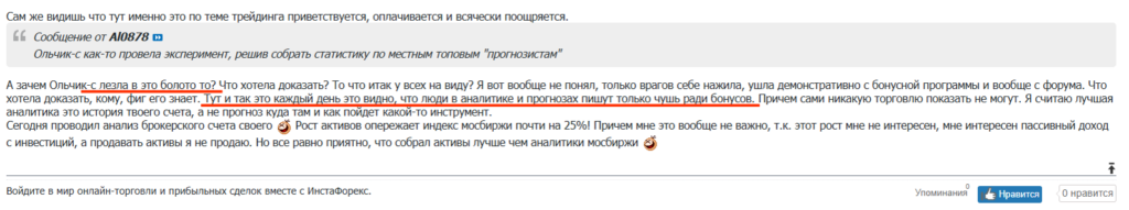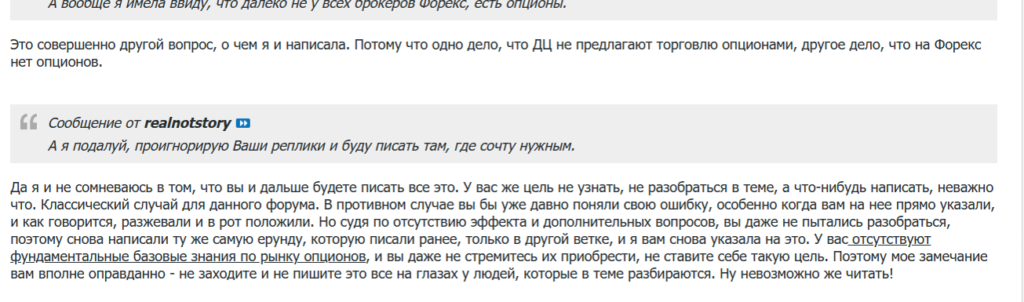 Что касается моей истории, то, конечно, у админа было ко мне много личного, иначе не объяснишь такое количество банов. Как я уже писала, я была яркой участницей, мои посты привлекали внимание, может, это его и беспокоило. Потому что на форуме каждый день пишутся вещи куда более крамольные, чем писала я, но участниками, гораздо менее популярными. Ежедневно люди оскорбляют друг друга, упрекают кого-то или всех в бонусхантерстве, иронизируют над аналитическими ветками, наполняющимися псевдоаналитическим бредом, заявляют, что успешных трейдеров на форуме нет и т.д и т.п.