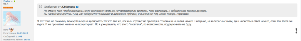 «Может, пора принять меры и убрать с форума одного из тех немногих, кто ещё пишет, приходя в сознание?» — подумал в тот момент Гелиос и побежал предъявлять за отзыв трёхлетней давности.