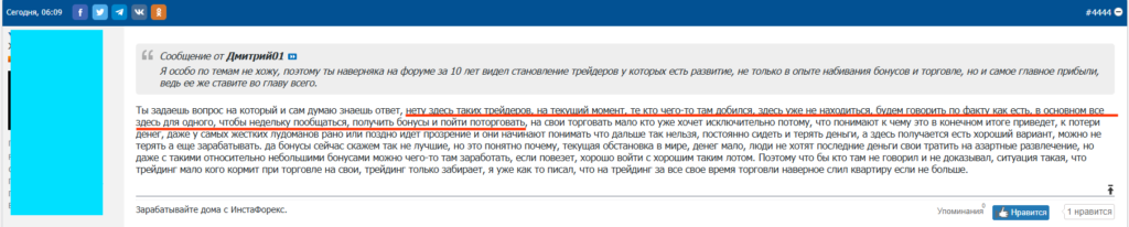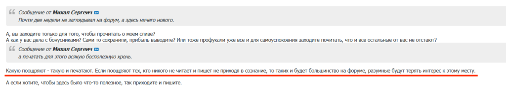 Это с одной стороны, а с другой … Поток сознания, который льётся на форуме — это что-то с чем-то! Столько бреда, сконцентрированного в одном месте, вы не встретите нигде на просторах интернета! Многие бонусхантеры даже не стараются писать что-то вменяемое. Часто не могут сложить несколько слов в одну мысль, не то, чтобы удержать её в одном абзаце или не дай бог в целом сообщении! Пишут неграмотно, не могут согласовать времена и склонения. Годами переливают из пустого в порожнее. Особенно такая картина характерна разделов «Коллективный разум» или «Школа трейдинга». Часто даже невозможно понять, что хотели сказать. Да и мне кажется, что они и сами не могут понять, что написали. Примерно такие посты заполняют форум: