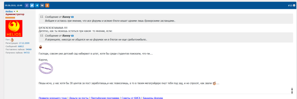 Когда‑то в сети на одном из любительских сайтов было опубликовано интервью с Helios, где он заявлял о своей «успешной карьере трейдера» и о том, что именно трейдинг позволил ему эмигрировать в Европу в начале нулевых. Сейчас уже это интервью исчезло. Оно и понятно, ведь образ «успешного трейдера», который сутками сидит на форуме, читая километры текстов «ради букв» за зарплату администратора, ближе к жанру фэнтези, чем к реальности.