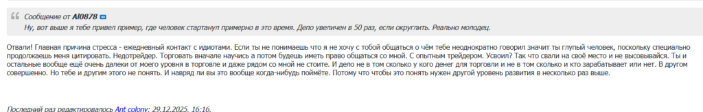 В этой истории нет информации о невечных банах, которыми админ осыпал регулярно. Например, за комментарий к комментарию о том, что в каких-то ветках строчатся посты о бессмысленном опционном анализе…))) Так и написал: за хамство. Может, выложу коллекцию скриншотов этих абсурдных банов в ближайшем будущем.