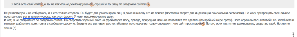 Вот и задумайтесь, по насколько мелочным основаниям я получила вечные баны. Знакомые спрашивали: «За что на этот раз?» Я отвечала: читайте мои последние посты, там всё есть, ничего не удалено. Но они не находили в них ничего криминального. Потому что смотрели непредвзято. Уверена, любой адекватный администратор другого форума, увидев эти причины, только усмехнулся бы и подумал: «Здесь явно что-то личное».
