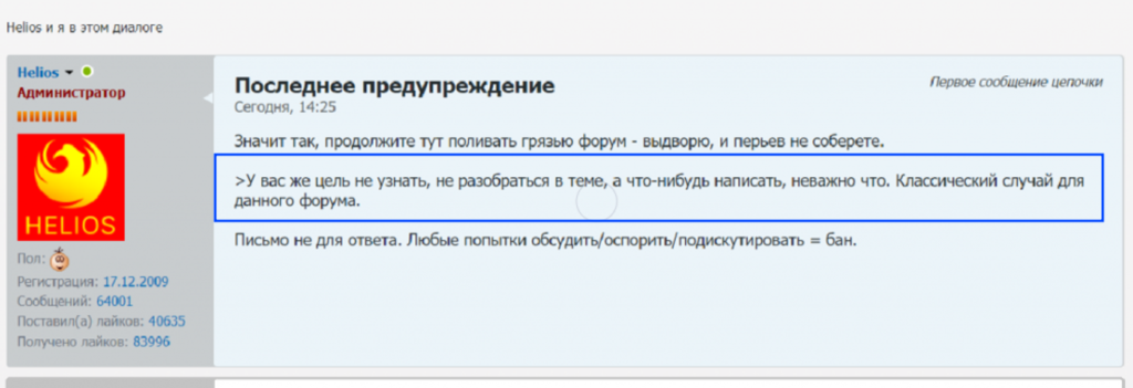 Один из таких вечных банов  с хамским предупреждением Helios ниже. Можете заценить, как он общается с участниками в личку и за какие фразы банит навечно:
